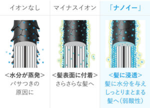 マイナスイオンは髪の表面に付いてサラサラな髪に導いてくれるのに対し、ナノイーは髪の内部までしっかり浸透!