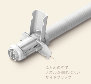 立体ロングノズルが先端についており布団の中に空間を作ってくれ、またノズルが倒れにくいようにサイドフラップもついており布団の中に温風を広げてくれます。