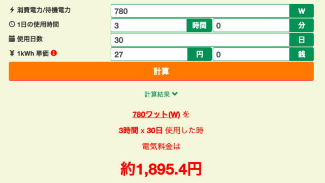 1ヶ月1日あたり3時間、月に30日使用した場合では電気代が1895.4円。