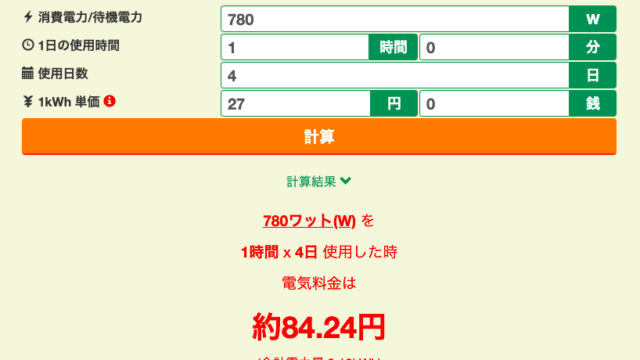 1ヶ月1日あたり1時間、月に4回の使用でなんと電気代は84.24円。