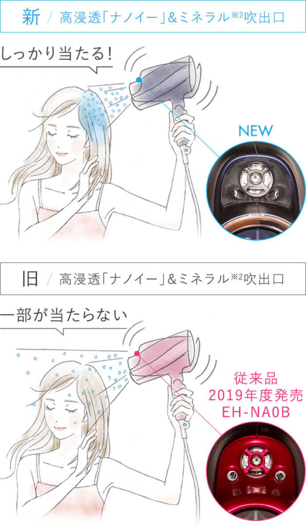 EH-NA0Eではミネラルの吹き出し口の形状が進化したので、高浸透ナノイー&ミネラル風を今までよりも髪に届けやすくなりました。