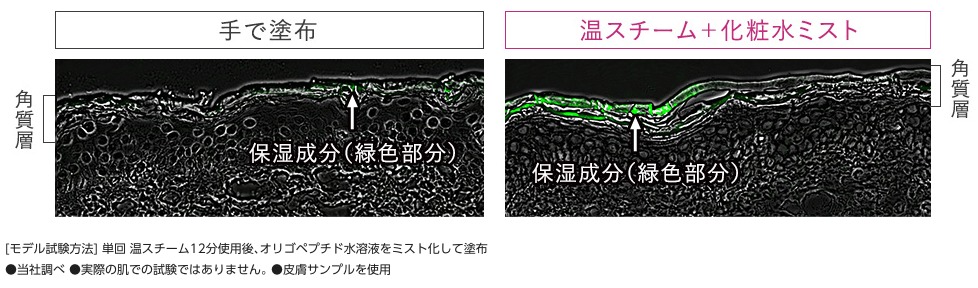まず温スチームでお肌をたっぷり保湿し、角質層までうるおいを浸透させます。